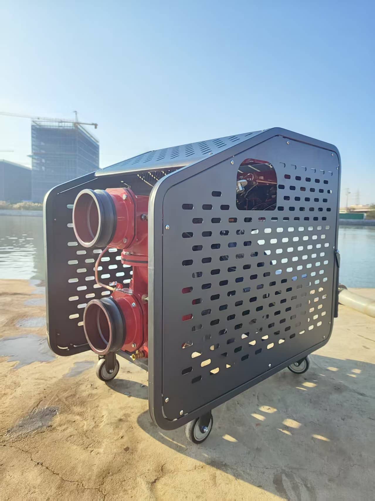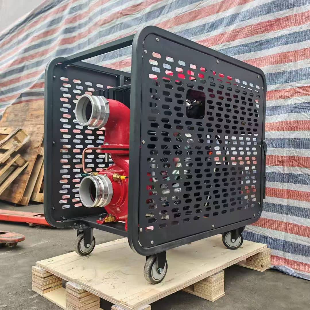 Made of cast iron, it features a model TDP-6 with 150mm (6-дюйм) inlet and outlet connections, both equipped with quick couplers for easy setup. It can achieve a maximum flow rate of 330 cubic meters per hour and an upward head of 50 Метров, with a suction capability of up to 7 Метров. The pump operates in a tailgas self-priming mode, with a startup time of less than 50 seconds at a rotational speed of 3600 Оборотов в минуту, powered by a 24.5 kW engine. It has a displacement of 998.8 ml, an 8-hour continuous working capacity, and a 17-liter fuel tank. The pump measures approximately 1030×665×960 mm and weighs 166 кг. It is ideal for rapid and reliable flood water removal.