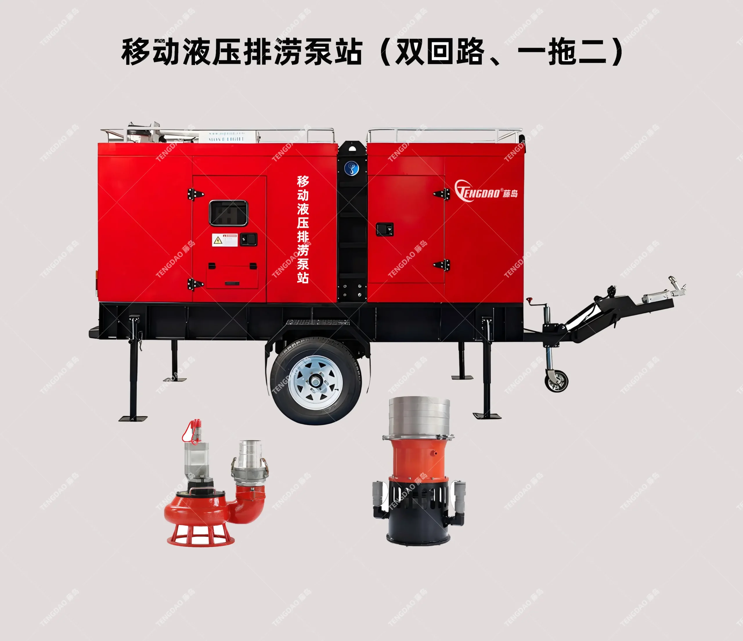 **Trailer-mounted Hydraulic Drainage and Lighting Pump Station (Dual-circuit, One-tow-two)** Powered by a **Cummins** engine with **80 HP**, this station features a single-axle two-wheel, silent-type trailer design for easy mobility and low noise operation. It includes two pumps: